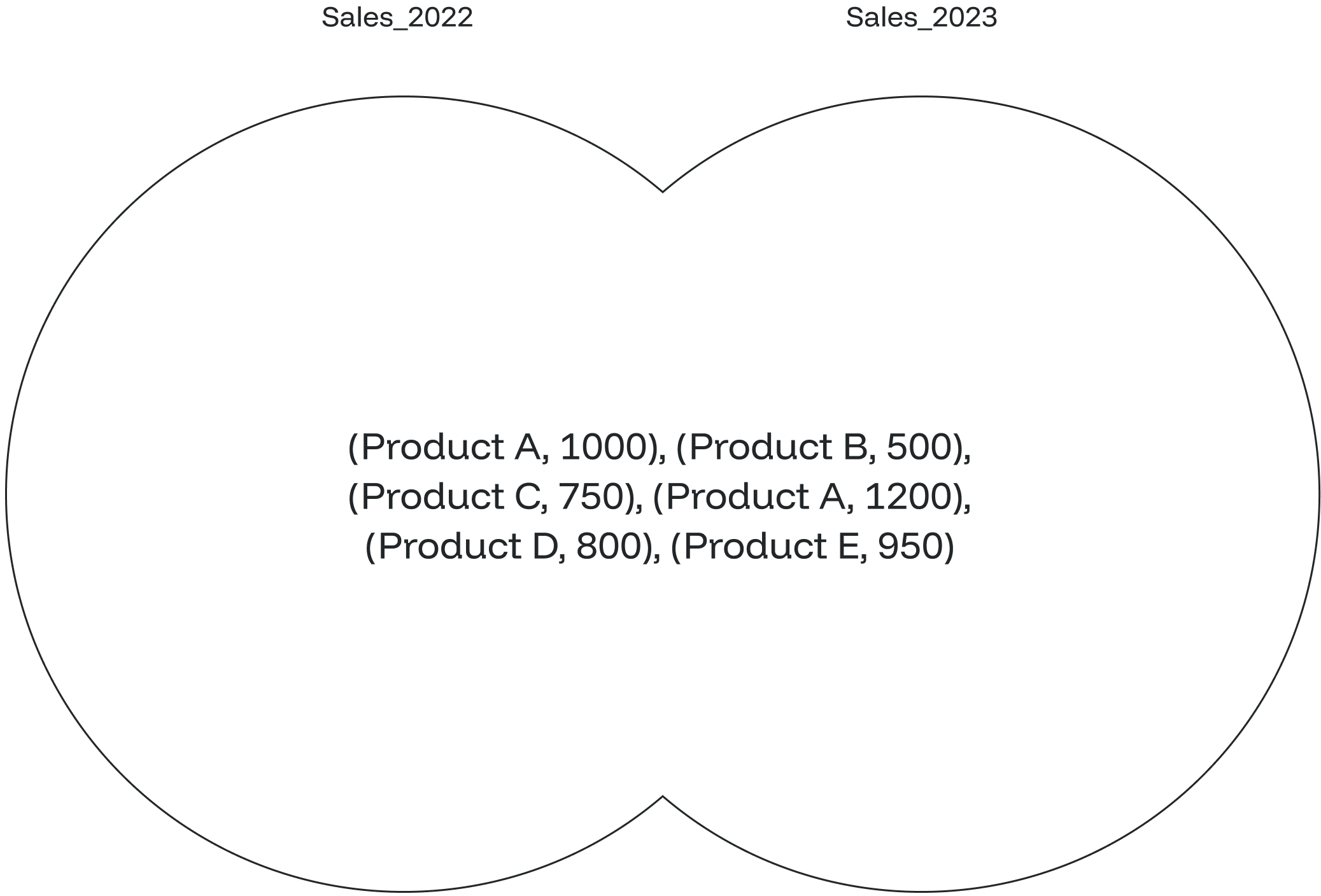 Suppose you have two separate tables,sales_2022 and sales_2023, containing sales data for different years. You want to combine the sales data from both tables to get a complete list of sales transactions without removing duplicates.